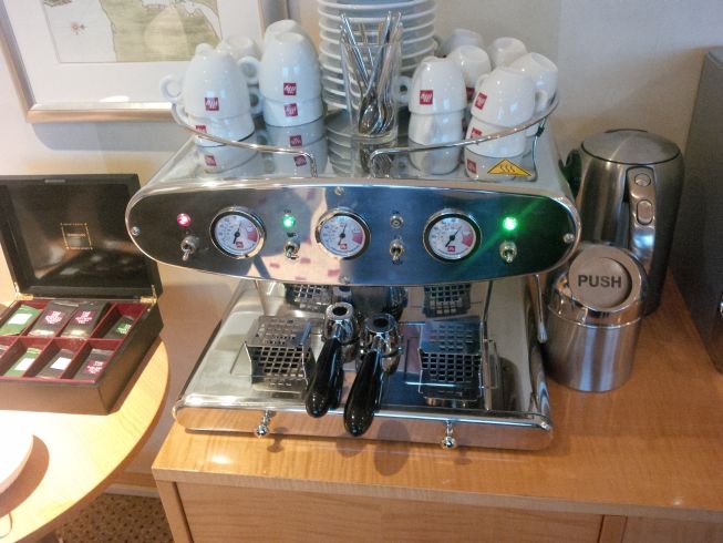 Ah, better. Inside the lounge. Espresso? Why, yes!