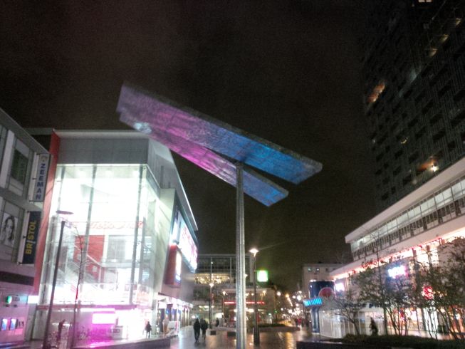 Rotterdam has some cool things. I have no idea what they are. This is two big opulescent panels that spin and rotate on a pole.